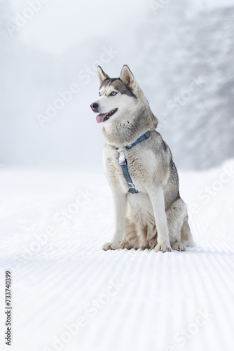 Fototapeta premium Purebred Husky dog portrait with red scarf, sitting in snow smiling