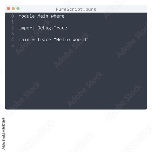 © vector_master, Obraz premium PureScript language Hello World program sample in editor window
