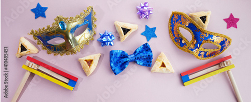 © vetre, Fototapeta premium Purim celebration. Hamantashen or haman ears, noisemaker and mask on grey background. Top view