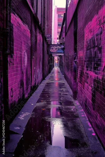 Fototapeta premium Purple alleyway reflection, urban grunge, city backdrop, moody atmosphere, graphic design