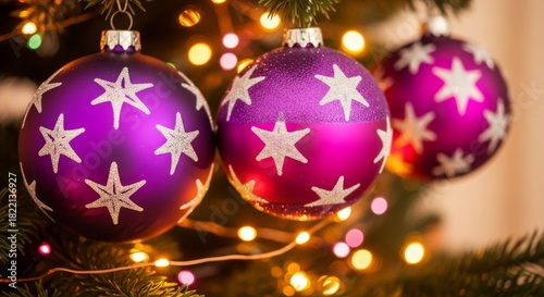 Fototapeta premium Purple and Pink Christmas Baubles with Glitter on a Festive Tree Branch