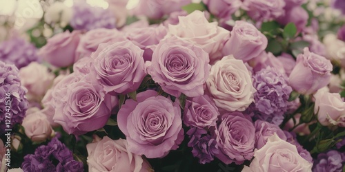 © Morninghead, Fototapeta premium Purple and pink roses bouquet for weddings or celebrations with soft background