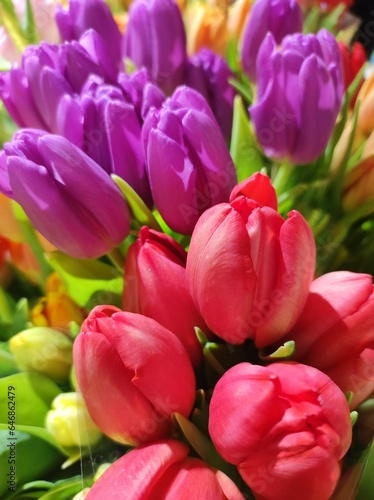 © Eleonora, Obraz premium Purple and red tulips bouquet