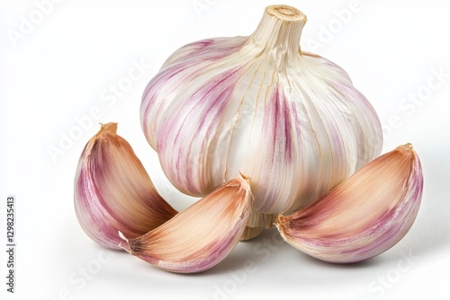 © Wiravan, Obraz premium Purple And White Striped Garlic Bulb And Cloves On White Background