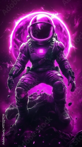 Naklejka premium Purple Astronaut on a Desolate Alien Planet, Illuminated by a Glowing Orb
