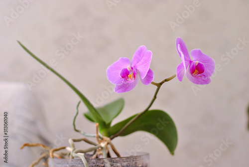 Obraz premium Purple beautiful blooming orchid branch closeup picture. Flower macro photo....
