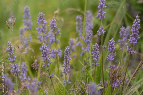 Fototapeta premium Purple blossoms and green grass backdrop in spring garden