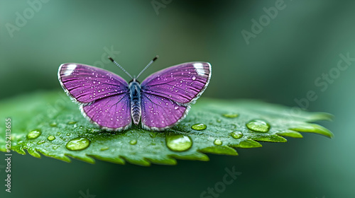 Naklejka premium Purple butterfly on leaf, dew drops, green background; nature beauty