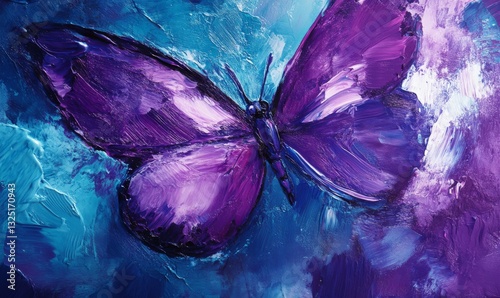 © Александр Михайлюк, Obraz premium Purple butterfly painted on a vibrant, swirling blue background.