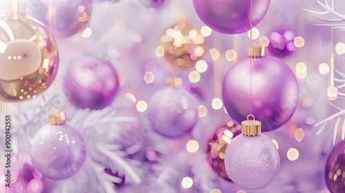 © Diffin, Fototapeta premium Purple Christmas baubles ball and holiday composition. Merry Christmas and Happy New Year background.