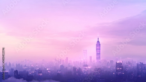 Fototapeta premium Purple city skyline at dawn, hazy cityscape with tall skyscraper.