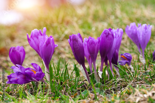 Fototapeta premium Purple crocus flowers in snow awakening in spring