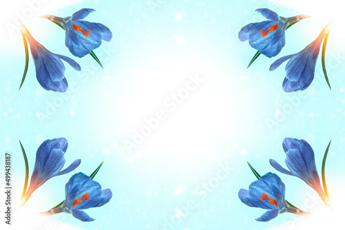 Fototapeta premium Purple crocus flowers isolated on blue background.