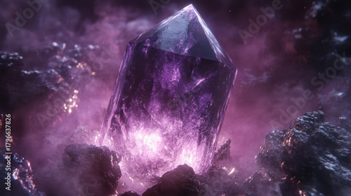 Obraz premium Purple crystal, glowing in dark volcanic landscape
