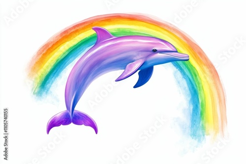 Naklejka premium Purple dolphin leaps; rainbow watercolor background.