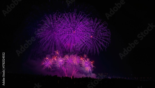 Fototapeta premium Purple fireworks illuminated the night sky brilliantly.