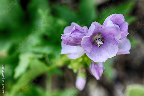Fototapeta premium Purple flower closeup rests against a green out-of-focus background.