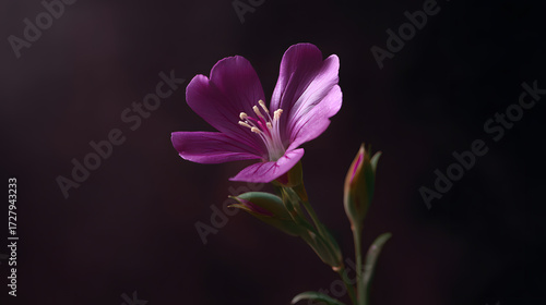 © Moddy, Fototapeta premium Purple Flower's Delicate Beauty: A close-up showcases a solitary purple flower, with its delicate petals, set against a dark background, revealing its exquisite beauty and intricate details.