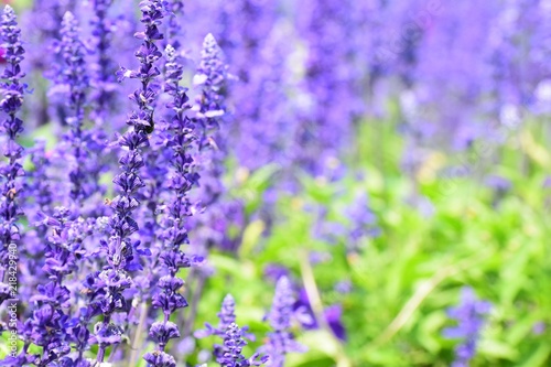 Naklejka premium Purple flowers against a green background with a shallow depth of field and selective focus on the flower petals.