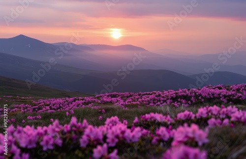 © homeganko, Fototapeta premium Purple Flowers at Sunset in the Mountains