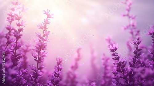 Naklejka premium Purple flowers bloom, sunlit and ethereal. Soft focus, dreamy scene