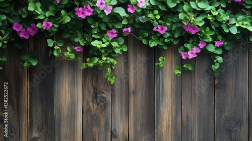 © Nutsananya, Fototapeta premium Purple flowers blooming on rustic wooden fence.