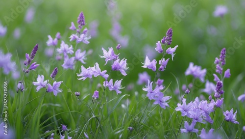 © Lasvu, Naklejka premium Purple flowers in a green field with a soft focus background.