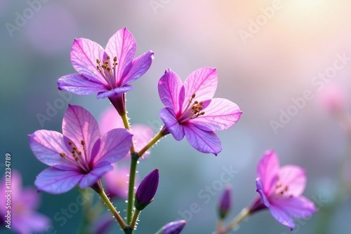 © chaiwat, Fototapeta premium Purple flowers of Petrea volubilis blooming in the morning dew against a white background, morning, early morning, dewy petals