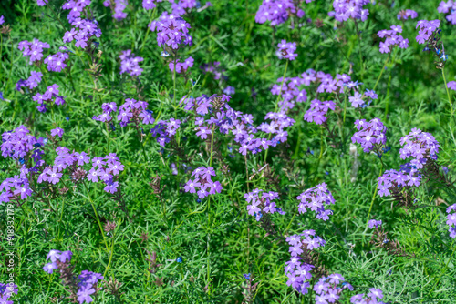 Naklejka premium Purple flowers of verbena laciniata blooming in botanical garden. Flowering herbaceous perennial plant is slender vervain or tuberous. Hedge of verbenaceae family used in alternative medicine.