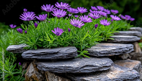 © Carolin, Fototapeta premium Purple Flowers on Stone Steps