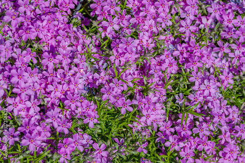 © icemanphotos, Naklejka premium Purple flowers with green plants. Natural texture