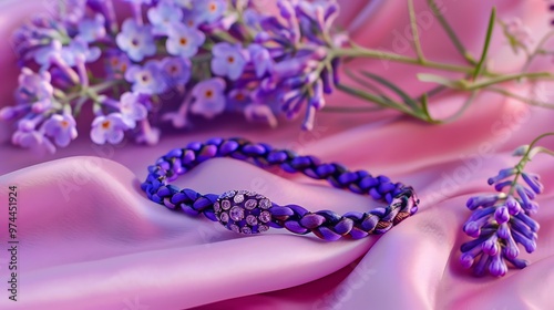 Obraz premium Purple friendship bracelet with unusual braiding on lilac textile next to flowers on pink and purple background