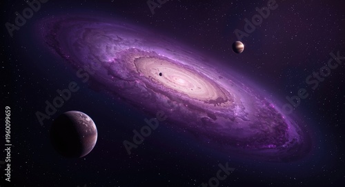 Fototapeta premium Purple galaxy disk with three planets floating in space
