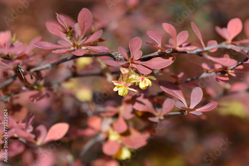 © nahhan, Obraz premium Purple Japanese barberry branch with flowers