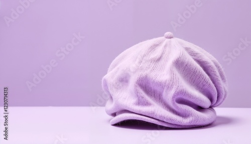 © Natalya, Obraz premium Purple knitted beret on soft lilac background