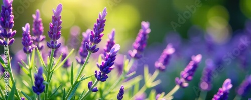 Naklejka premium Purple lavender blooming in the garden with green leaves, blossom, plants,...