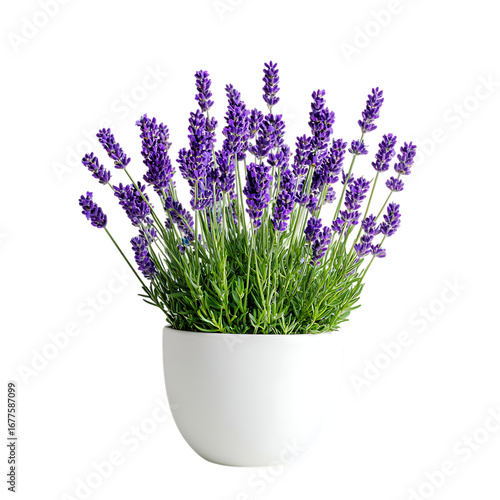 © MONOHOR, Fototapeta premium Purple lavender flowers in a modern white pot, isolated on black.