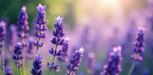 Naklejka premium Purple lavender flowers in full bloom against a dreamy, unfocused backdrop ,...