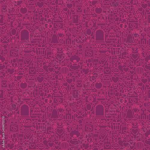 © Designpics, Fototapeta premium Purple Line Wedding Seamless Pattern. Vector Illustration of Outline Tile Background. Love and Heart.
