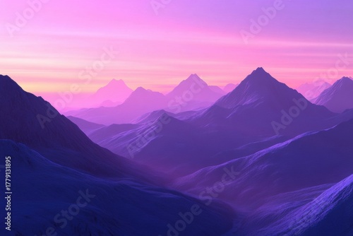 © Nopparat, Fototapeta premium Purple Mountain Majesty: A breathtaking vista unfolds as towering peaks pierce the twilight sky, painting a serene scene of natural beauty and tranquility.