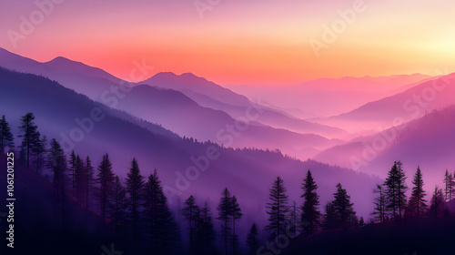 © Siasart, Obraz premium Purple Mountain Ranges At Sunset Background