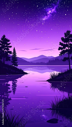 © Jhon, Fototapeta premium Purple night landscape with lake reflection