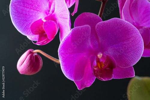 © fotofabrika, Fototapeta premium Purple orchid branch on dark black background close up