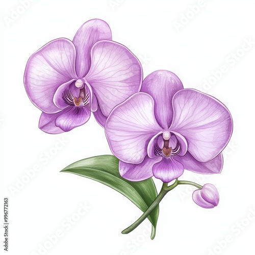 © Template_Design, Obraz premium Purple orchid flowers on a stem with green leaves, white isolate background.