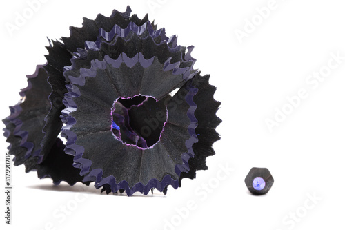 Obraz premium purple pencil and shavings on white paper background