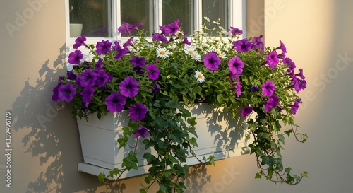Fototapeta premium Purple Petunias and Daisies in a Window Box with Ivy