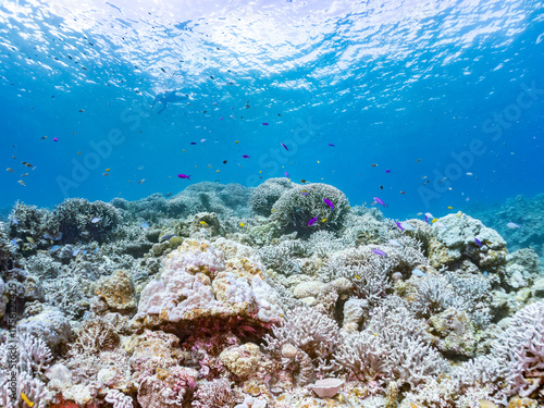 © d3_plus, Fototapeta premium ハナゴイ, Purple queen, Amethyst anthias, Pseudanthias pascalus, ハタ科, デバスズメダイ, Blue green damselfish, Chromis viridis, Blue green chromis, スズメダイ科, 美しいサンゴ礁と熱帯魚の群れ。 安室島沖縄県 島尻郡慶良間諸島座間味島-2025 サンゴの産卵があり卵が漂う。沖縄