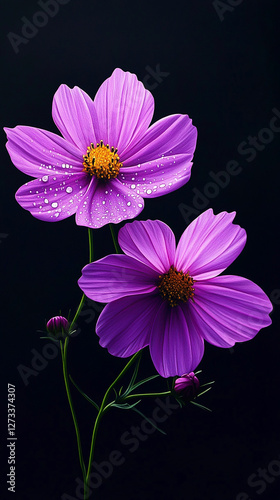 Fototapeta premium Purple simple flowers with dew drops on a black background.
