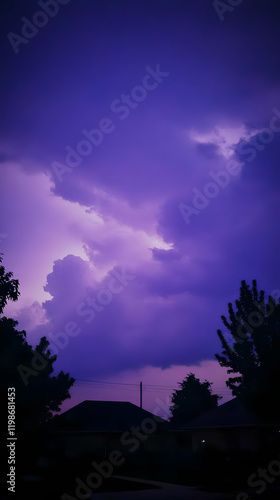 © Siasart, Fototapeta premium Purple Sky Illuminates Clouds Above Silhouetted Houses at Dusk