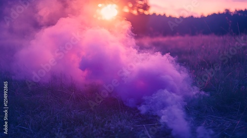 Naklejka premium Purple Smoke Billows Across Grassy Field at Sunset